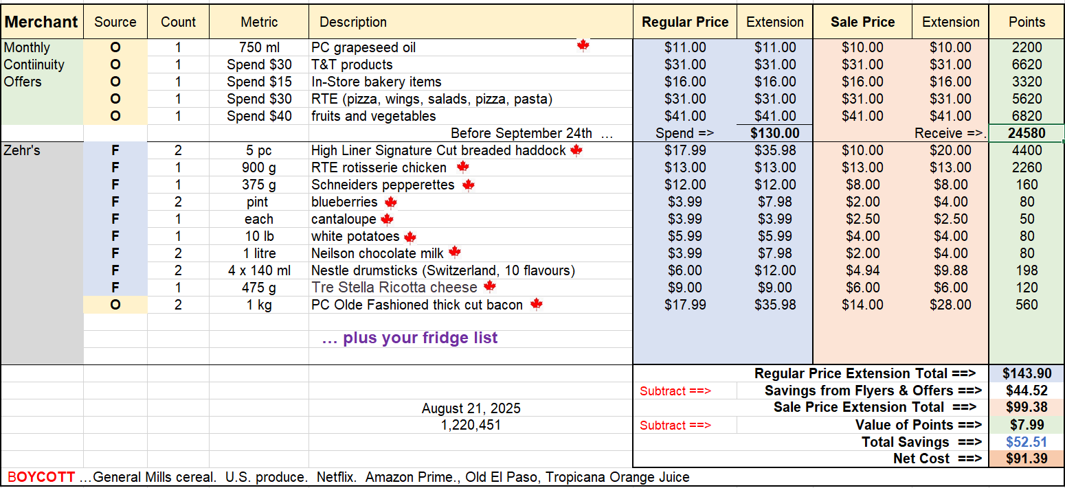 I tried one of those banana leaf wrapped PC products, the shrimp I think. It was just OK. I see they have the tilapia variety on this week for $5. Worth a try if you like tilapia, but I would shy away. It was the normal late-month flyer. They do list all the new continuity points offers that run through September 24th. I listed them for you at the top of the chart. Remember, the corporate mind assumes that you have a short memory. Disappoint them. Sale prices and points offers are purposely kept apart; but they will match up before the month is out. That's when you hit a double by getting extra points and something on sale at the same time. Cut the bacon across the grain into thirds. They will slip into a medium Ziploc freezer bag. Here's your list:
