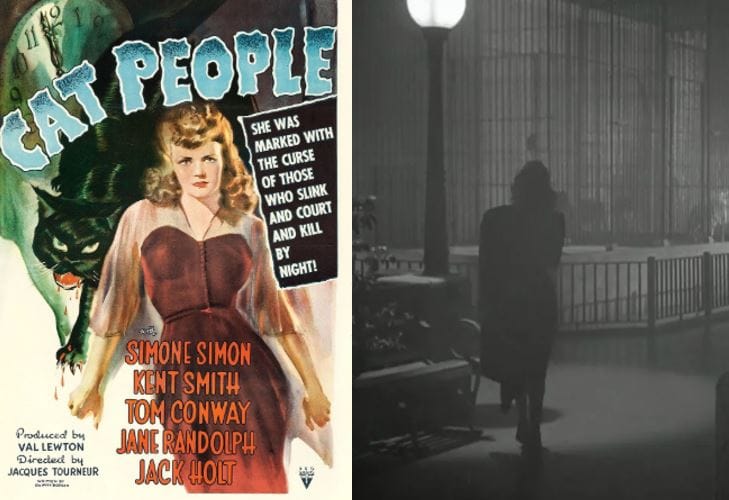 As I scurried down the rabbit hole researching the term jump scare, I discovered that the generally accepted first example of this actually has its own name. It is called The Lewton Bus. A woman is walking through dank, atmospheric London streets after dark. Constantly glancing back. The tension culminates when she stops at the curb and the bush behind her moves in the wind. Just then, with a roar and a hiss, a city bus screeches to a stop right in front of her. The driver announces the bus is headed to Lewton. In 1947, this was one of the new "terror films" released by RKO Radio Pictures. It was the original Cat People.