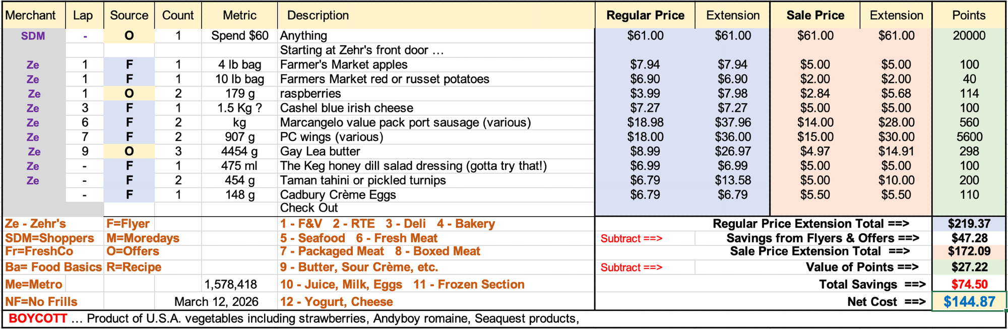 You stir fry your protein and vegetables (the more the merrier) separately and serve it over something. I have selection of whole wheat pastas that I am forced to consume but lately, I've been on a bit of a cabbage kick. Pickled shallots, garlic, ginger, ghee, and finely sliced cabbage in just enough stock to steam it, then continue until most of the liquid is gone and edges are turning crispy. I used a slivered pork chop, carrots and broccoli with the Thai green curry kit. What a feast! We have continued to eat out of our pantry and SWMBO is away next week, so our food budget will be cut by three or four percent 👀 ! I did stock up a bit on my Saturday morning run and spent $158 grabbing 28K in points. Here is your list: