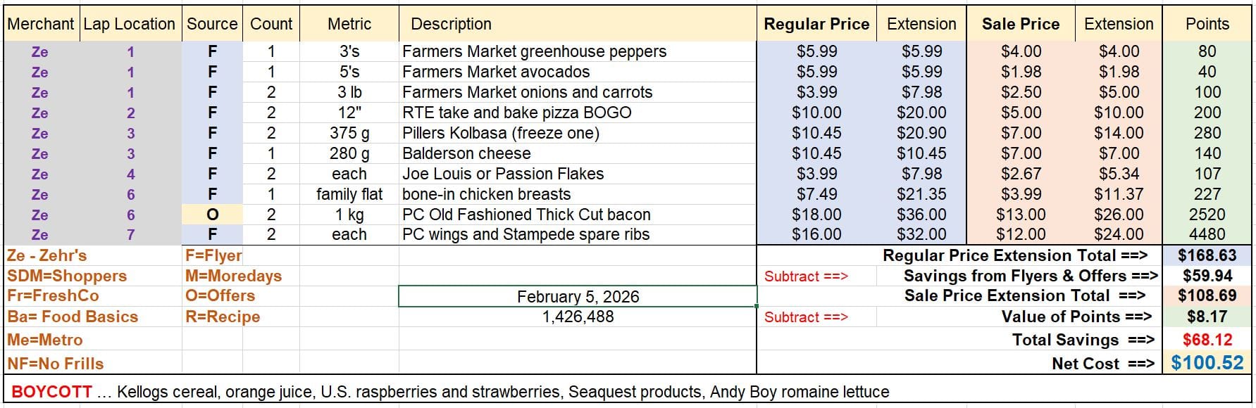 Did you earn 100,000 points last week? It is only February 5th and we are at 48,311 points on a $173 grocery spend! It was all there for you if you spent the entire $295 from our list last week. We just can't stuff any more groceries into this house. I may try and live out of our larder / freezer for a month and document the drawdown? Hmmm. You will also see some changes to the chart this week. Setting up for The Loop which is a shop the perimeter concept that I saw someone speaking about many years ago. It will also satisfy one of the re-branding suggestions (DS) that I received. OK flyer but very quiet on the Offers front, last week was a blowout! Bonus Redemption at Zehr', here is your list: